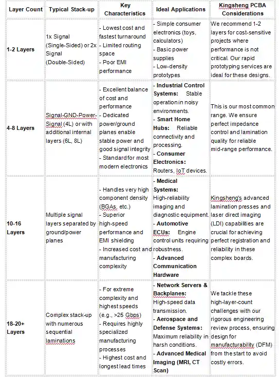 In the world of electronics design, the printed circuit board (PCB) is the foundational bedrock upon which all components are mounted. One of the most critical decisions an engineer makes is selecting the appropriate number of layers for a PCB. This choice, ranging from simple single-sided boards to complex 20+ layer assemblies, fundamentally impacts the board's functionality, performance, cost, and manufacturability. At Kingsheng PCBA, with over a decade of expertise in advanced PCB fabrication and assembly, we understand that navigating this decision is key to a project's success. This guide provides a systematic approach to selecting the optimal PCB layer count for your application.